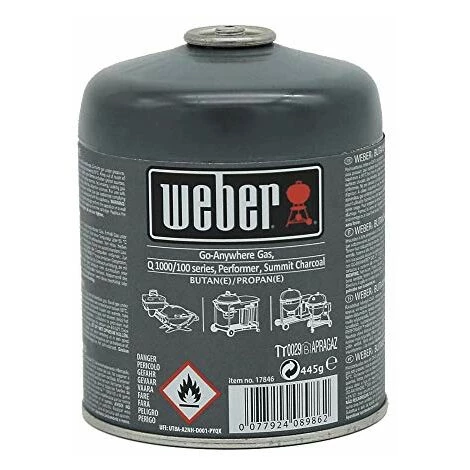 La cartouche de gaz Weber de 445 g est destinée à la série Q 1000, au barbecue nomade à gaz go-anywhere et au performer avec allumage gaz. Pour réchaud de camping. Haute qualité.